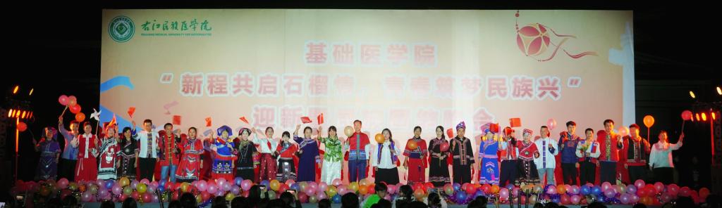 为深入贯彻党和国家关于民族工作的方针政策,传承中华民族优秀传统文化,展现以爱国主义为核心的中华民族精神,巩固和发展平等、团结、互助、和谐的社会主义民族关系,促进师生交往、交流、交融,加快推进基础医学院“四个一流”建设,2025年11月15日晚,基础医学院于百东校区田径场隆重举行“新程共启石榴情,青春筑梦民族兴”迎新暨民族团结晚会。学校党委常委、副校长解继胜,党委统战部、党委学生工作部、校团委、各二级学院领导代表及基础医学院全体师生欢聚一堂,共赴这场充满民族风情的盛会。