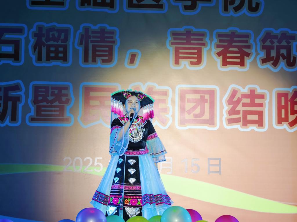 晚会以一场别开生面的教师代表民族服装秀拉开帷幕。教师们身着融合各民族文化元素的特色服饰闪亮登场,在悠扬音乐的配合下,尽情展示各民族风采。此环节既直观展现民族文化魅力,又巧妙呼应“石榴情”主题,传递民族团结交融氛围,为晚会奠定“民族团结、青春筑梦”基调。