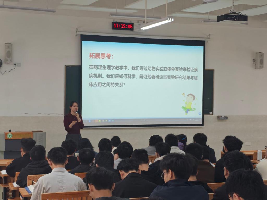 本次课程创新采用基础医学与临床医学联合授课模式,是学院深化医教融合、推进教学模式改革的一次积极探索与实践。临床医学院心内科黄达老师走进课堂,在课程绪论环节结合真实临床病例,生动阐释病理生理学与临床诊疗实践的内在联系,帮助学生直观认识课程专业价值,有效激发学习兴趣与科研探究热情。高洁老师立足课程特点与人才培养目标,精心设计教学环节,通过直观形象的图片展示引导学生快速进入学习状态;课前系统梳理课程学习方法与学习资源,着力培养学生自主学习能力;教学中紧密联系生活实际与典型病例,将抽象理论知识具象化、通俗化,有机融入医者仁心、医德医风等价值引领,实现知识传授、能力培养与价值塑造的有机统一。课堂设置分组讨论环节,教师充分发挥启发、引导、点拨作用,突出学生主体地位,有效提升课堂互动实效与学生参与度。