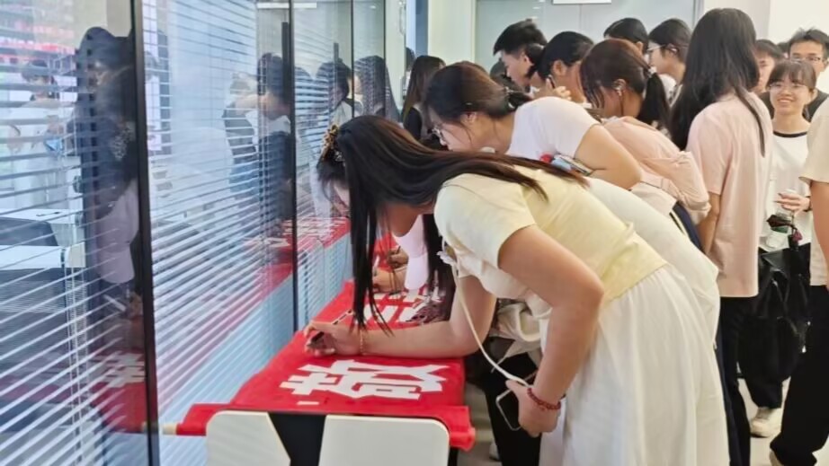 同学们在致敬横幅上签字承诺