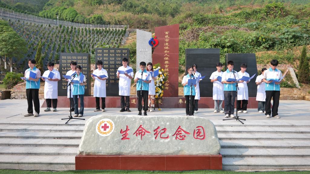 为深刻缅怀遗体和人体器官捐赠者的无私奉献精神,弘扬正能量,倡导新风尚,扎实推进“三生三信”教育(探究生命奥秘、守护生命健康、追求生命价值、从医信念、职业信守、人生信仰)走深走实,近日,百色市红十字会、市民政局、市卫生健康委员会联合右江民族医学院基础医学院,在百福生态陵园共同举办2026年百色市人体器官捐献者缅怀纪念活动。右江民族医学院基础医学院学生代表参加本次活动,以诗朗诵的形式向“生命使者”致以崇高敬意。