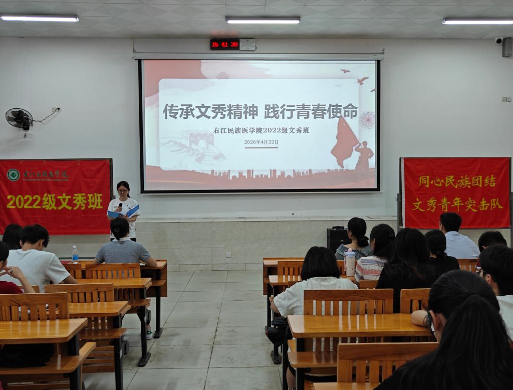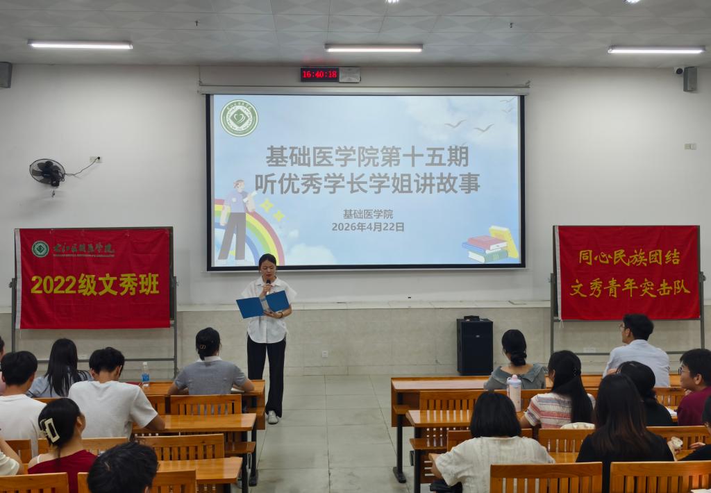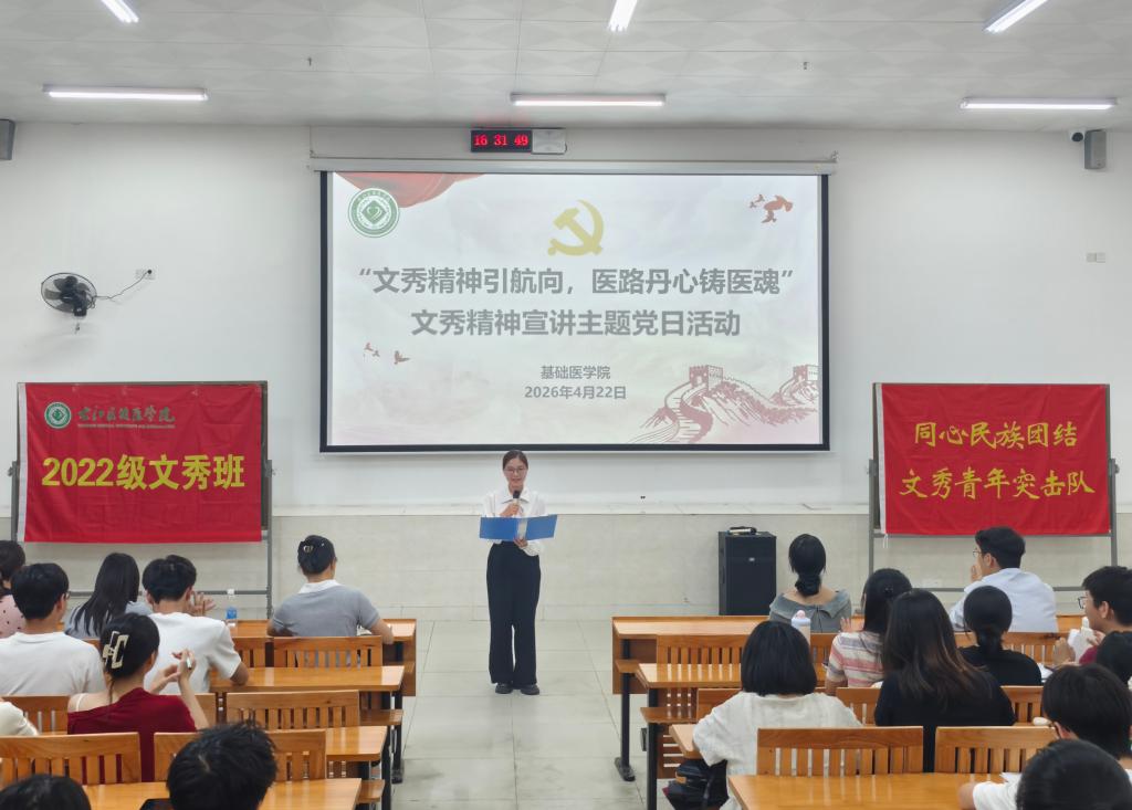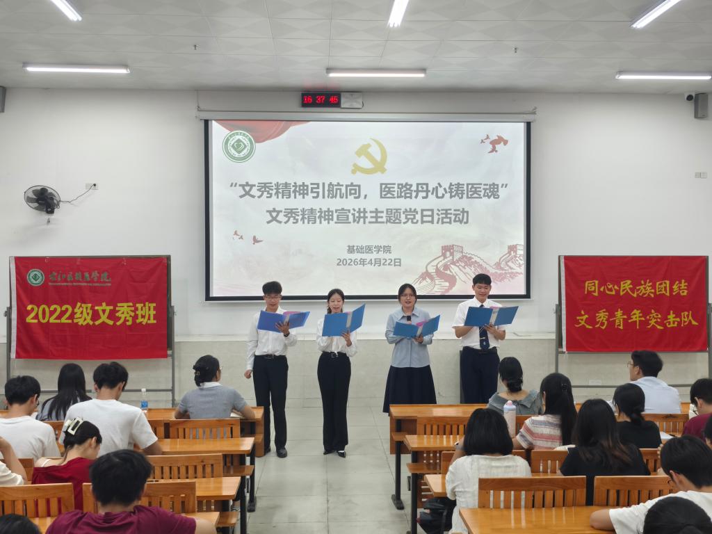 为深入学习贯彻习近平总书记对黄文秀同志先进事迹的重要指示精神,落实立德树人根本任务、推进“五育并举”全面育人,引导医学生传承榜样力量、坚定从医初心,2026年4月22日下午,基础医学院在百东校区守正楼A-107教室顺利开展“文秀精神引航向,医路丹心铸医魂”文秀精神宣讲主题党日活动。学院师生代表齐聚一堂,在重温时代楷模的奋斗足迹中,凝聚奋进力量,筑牢理想信念。
